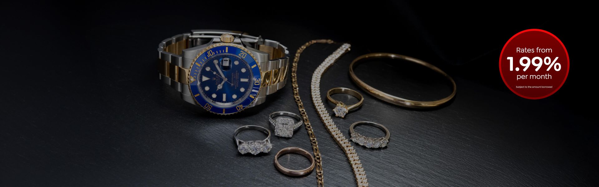 - Secured against items of gold, silver, diamond jewellery or prestigious watches